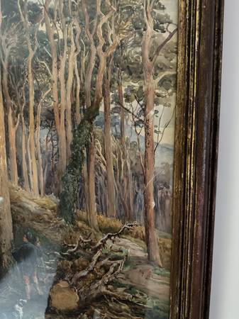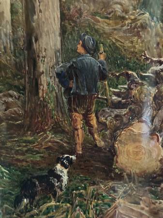 Large framed hand painted 19th century pastoral scene, featuring a woodsman and dog in a forest. Signed EARL wonderful, has been in my family for a couple of generations. watercolor on paper....