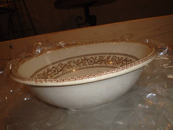 Antique farm house style bowl, approximately 18 inches in diameter, in decent condition, has a brown floral design inside the bowl. Clean condition.
