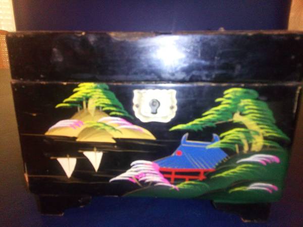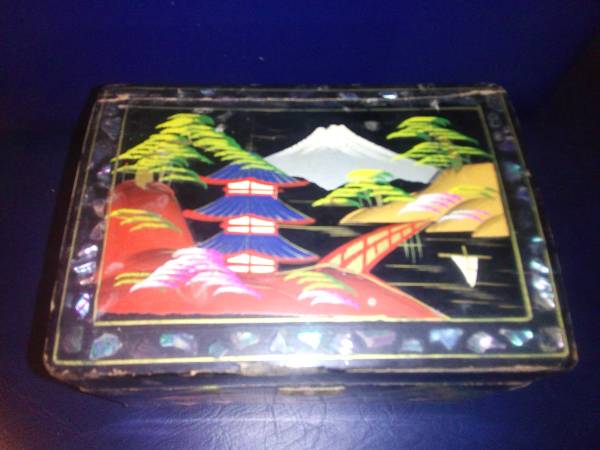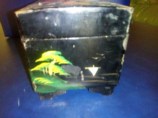 It is hand painted from the 1940's. These are rare. I've seen others but not with the same paintings. It looks great but does have some wear. There might be a 2nd level that's missing inside the box. The music does not play. There are chips, scratches, and one small crack. There's no key. Even with all that, it still looks great. A must have for collectors.