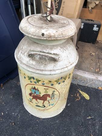 Old milk can, top has been drilled for a lamp, needs work, old elementary school desk, 1950’s with matching chair Email me with your phone number if interested