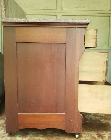 Antique Marble Top Bathroom Vanity/ Commode For Sale , I believe this is an Eastlake piece possibly Walnut from the late 1800's early 1900's , it's in decent condition with some scrapes , scuffs and ware from use , the marble top measures approximately 33" wide side to side by 19¾" deep front to back by 28" high and 35" to the top of the back splash , I'm only asking $125.00 for it As Is and believe this is a fair and reasonable price.........