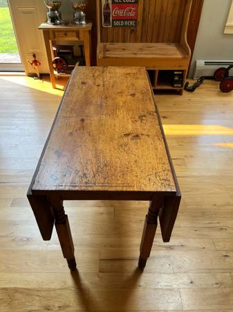 Beautiful antique drop leaf table made from old growth, southern pine, gorgeous grain and knots can’t get them like this anymore. Make a beautiful addition to any home.