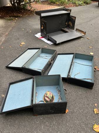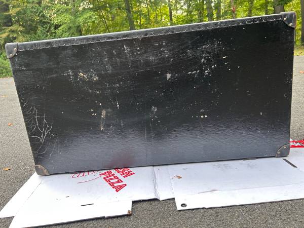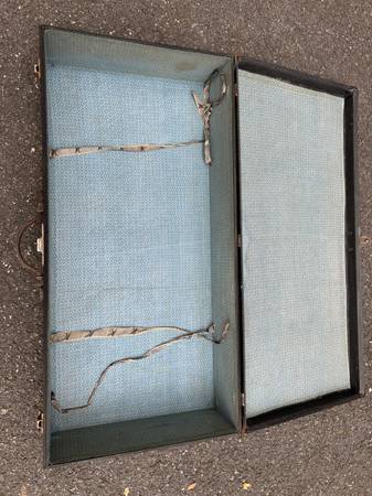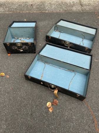 This Vintage Auto Touring Trunk with Nesting suitcases is a fully assembled antique piece perfect for those who appreciate classic travel style. Crafted with wood and canvas, this rectangular-shaped trunk features a hinged door mechanism, leather handles and nickel plated clasps. The black painted canvas finish adds to its vintage charm, making it suitable to add a touch of original accessories to their vintage automobiles. The two nesting suitcases included in this set offer storage options for clothes and the third suitcase is for hats, all within the early 20th-century time period.