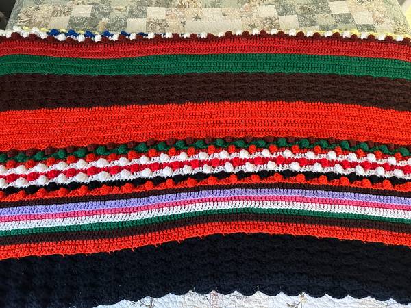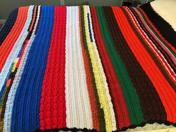Multi-Colored Hand-Knit Afghan/Throw - Orange/Black/Green/Brown/Blue/Red/White Approx. 70" x 52" Pictures taken on a "Full" size bed to give better sense of size New, Never Used Smoke-Free, Pet-Free...