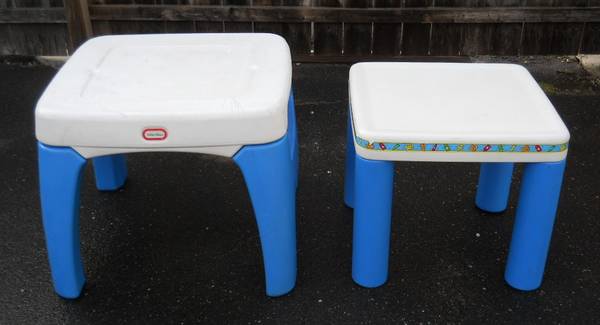 Hard plastic toddler tables each come with 2 chairs. Larger table set asking $45 and smaller table set asking $35. Good condition.
