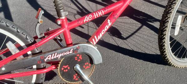 Used tag along type bike for kids, excellent for getting them ready to ride their own and working on being comfortable going fast and balancing. Bike stores small and will fit in a regular four-door sedans trunk.
