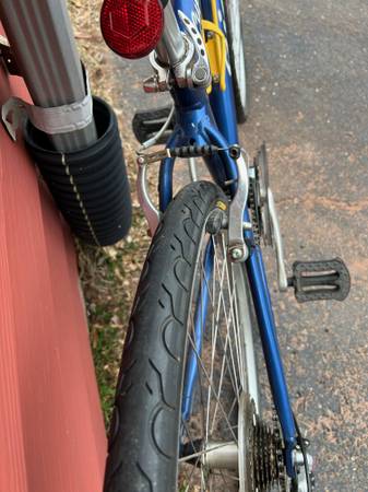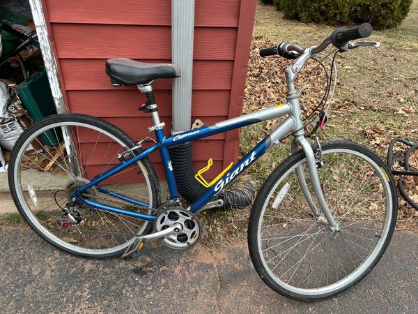 Men's Giant Cypress hybrid bicycle. Blue/silver color. Medium size. Should fit 5' 8" to 6' riders. Lightweight aluminum frame. SRAM GripShift 21 speed twist-type shifter. Shimano derailleurs. Adjustable handlebar. Comfort seat with spring suspension. Quick-release wheels and seat. Bottle cage. Very good condition mechanically and cosmetically. The bike has been sitting in the garage for several years and will need some tune-up. It rides as-is. Price is $100 cash. Serious inquiries only please. Ad will be removed when the bike is sold.