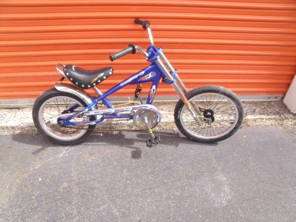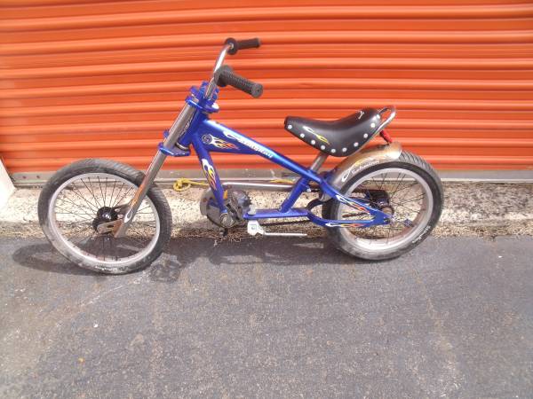 Awesome chopper motorcycle style bike made by STING RAY. Includes coaster brakes, kick stand, good tires, banana seat, chrome fender, hand grips. Good shape.