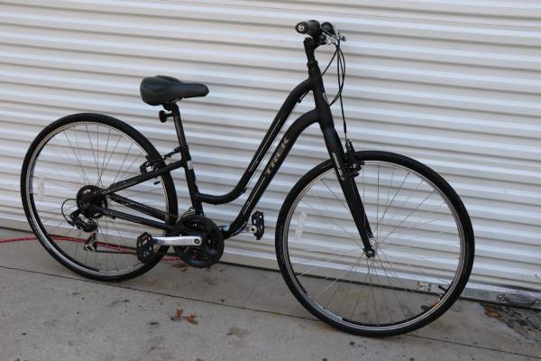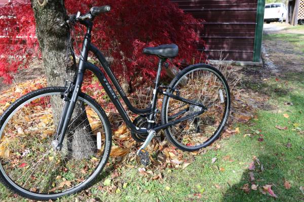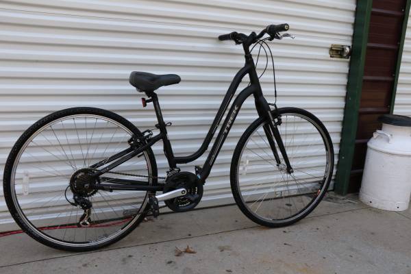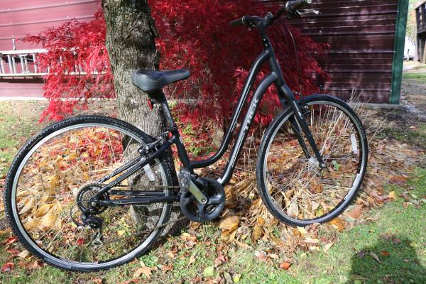 Makes for a wonderful gift, USA design like new Trek Step thru, very little miles on this, as clean as day one from purchase, 1 owner, still well loved, always hung up in climate control nonsmoking household. High end Shimano components, very comfortable to ride, extremely light with its ALPHA GOLD Aluminum frame material. Gearing is wonderful with its lock ring mega drive, making up hills as easy as can be while pedaling. Recent complete service through Local trek dealer for buyer piece of mind, rims checked for balance for maximum braking, cables, adjustments, etc., A very minor scrape from bike rack transport only on a few camping trips for therapy. Tires are in very good condition as tubes as well. also comes with full wheel and frame reflector set. Wonderful for the beginner or experienced rider, very easy to drive. Will make its new owner extremely happy!!!