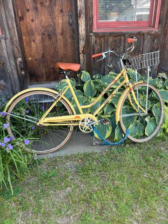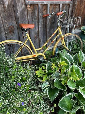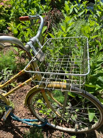 Nice old bike with basket and mirror for sale. Has been inside its whole life, tires hold air. Can be used for decoration or ridden with new tires.