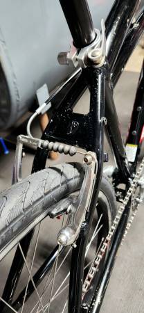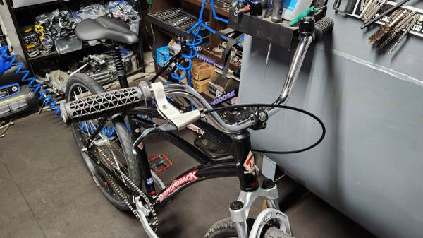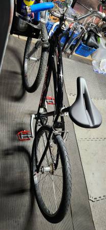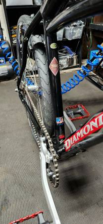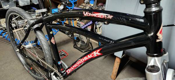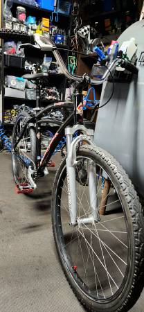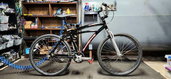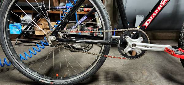 Late 90s aluminum Diamondback 3 bar frame (16" size) with a single speed drivetrain on 26" wheels. Very nice chrome riser handlebars with new AME Tri grips and Bontrager stem. New Bontrager commuter saddle on a very nice Bontrager suspension post. HJC 26x1.75 7X hoops on JoyTech hubs with 14G stainless spokes. Shimano Deore XT lever, Shimano cartridge square-taper JIS bottom bracket, Shimano cranks. Gearing is a 42T Shimano chainring with a Dicta 20T freewheel out back. A cool little 3-Bar single speed build that rides excellent and brakes confidently. Check pictures 📷 🤟