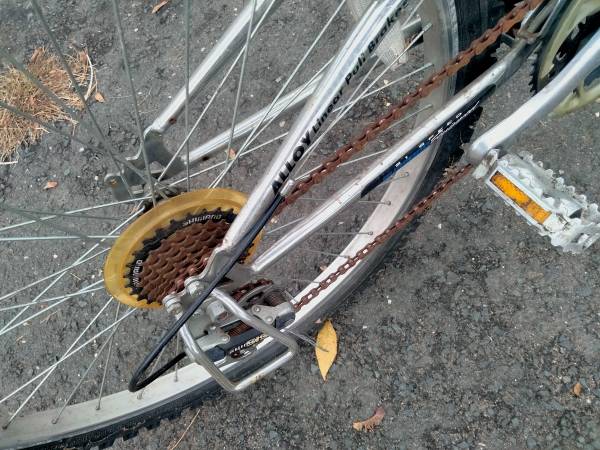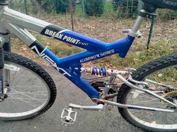 Found this bike while cleaning out a house. It's a nice NEXT brand articulated framed mountain bike. Aluminum frame and rides great. Needs a new front tire tube. It'll blow up for testing but leaks air and will be flat in a day. A little rust but nothing terrible. Could be a nice bike for someone.
