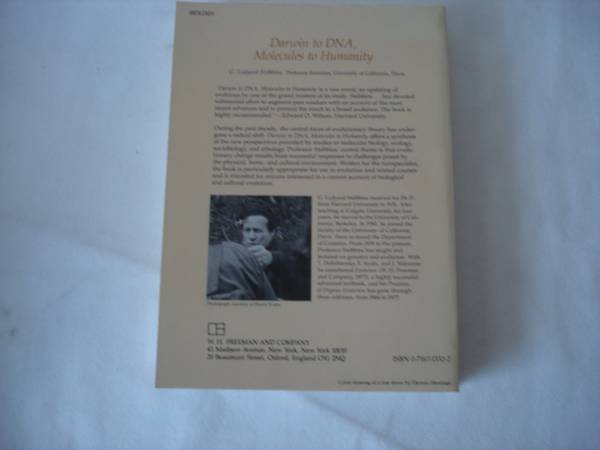 Darwin to DNA, Molecules to Humanity, G. Ledyard Stebbins. Paperback – Published by W.H. Freeman and Company – 1982, ISBN: 0-7167-1332-2. 491 Pages which includes the Index. Paperback Edition, Like New. Bindings Tight, Corners Square, No Creases no markings within the Book.