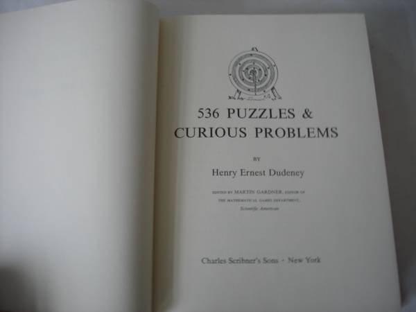 536 Puzzles & Curious Problems, by Henry Ernest Dudeney and edited and with an introduction by Martin Gardner. Hard-Cover (red with black lettering) - First Edition – Published by Charles Scribner’s Sons - 1967. No ISBN. Library of Congress Catalog Card Number: 67-15488. B/W Illustrations throughout the book. 428 Pages which includes the Index.