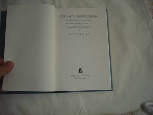 Climate Confusion, How Global Warming Hysteria Leads to Bad Science, Pandering Politicians and Misguided Policies That Hurt the Poor, by Roy W. Spencer. Hard Cover - First Edition - Encounter Books, Publishers - 2008. ISBN: 1-59403-210-6. 191 Pages Which Includes the Index.
