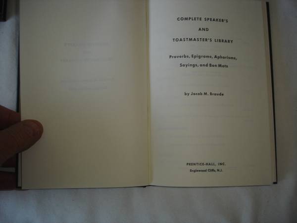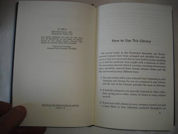 Hardcover (Dark Blue) books in New Condition. COMPLETE SET of Eight Books, Includes: Speech Openers and Closers; Rhyme and Verse; Human Interest Stories; Business and Professional Point makers; Definitions and Toasts; Origins and Firsts; Proverbs, Epigrams, Aphorisms, Sayings and Bon Mots; Remarks of Famous People.