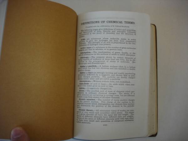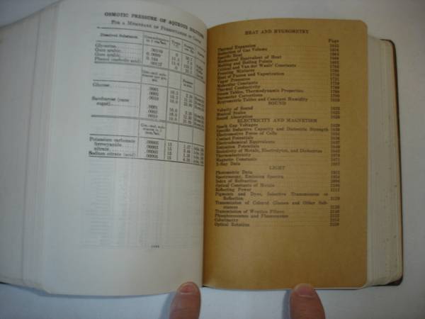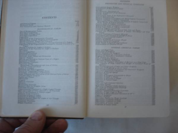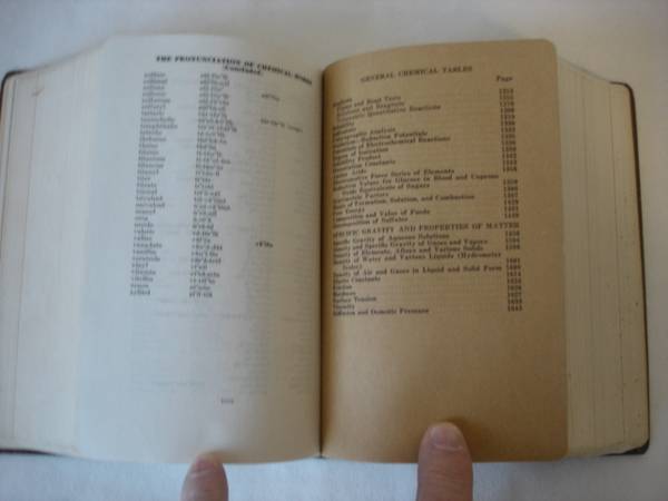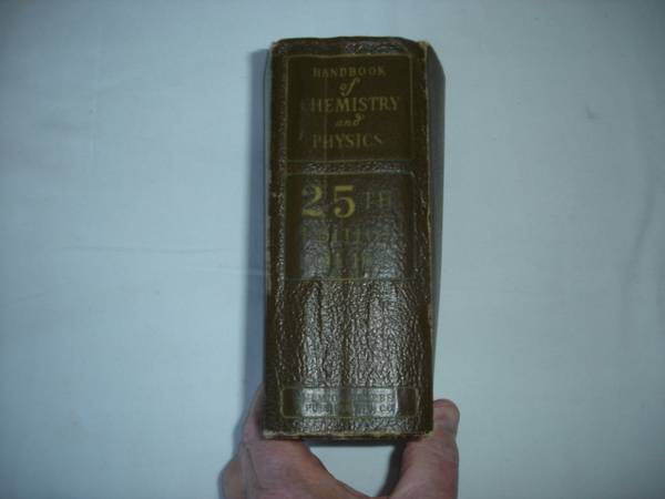 Handbook Of Chemistry and Physics, A Ready Reference Book of Chemical and Physical Data, by Charles D. Hodgman and Harry N. Holmes. Hard-Covers (brown with gilt lettering) no Dust Jacket – Twenty-Fifth Edition – Published by Chemical Rubber Publishing – July 1941. No ISBN. No Library of Congress Catalog Card Number. 2503 Pages Plus Tables and the Index.