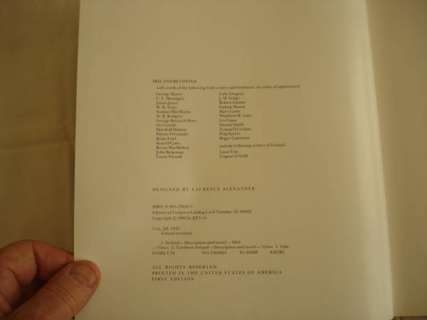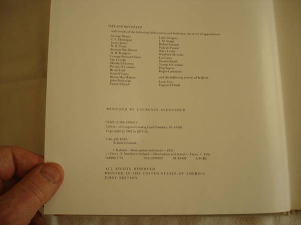 Ireland Revisited, by Jill Uris. Hard-Cover with Dust Jacket - First Edition – by Doubleday & Company – 1982. ISBN: 1-385-17616-3. Library of Congress Catalog Card Number: 81-43402. 152 Pages.