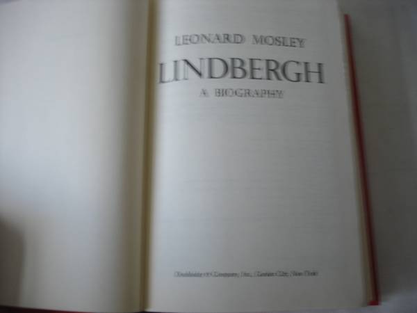 Lindbergh: A Biography, by Leonard Mosley. Hard Cover (black & red with gold lettering) with Dust Jacket – First Edition – by Doubleday & Company – 1985. No ISBN. No Library of Congress Catalog Card Number. 446 Pages which includes the Index.