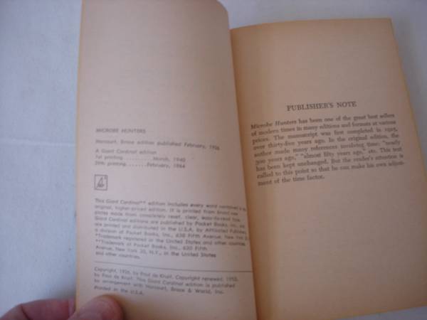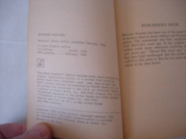 Microbe Hunters, by Paul De Kruif. Soft-Cover - First Edition, Second Printing – by Harcourt, Brace and Company - 1964. No ISBN. No Library of Congress Catalog Card Number. 342 Pages which includes the Index.