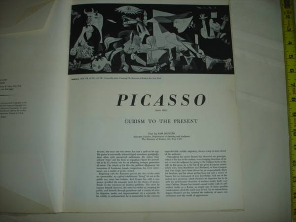 Picasso, An Abrams Art Booklet. 16 Full Color Individual Prints, in a paperback booklet, protected by a cellophane cover. Abrams provides a commentary explaining the name and history of each print in the booklet. Each print is on a 14” x 11” heavy paper sheet and the Print can be 8-10” high x 7-9” wide ready for your framer. The date of this booklet is 1957.