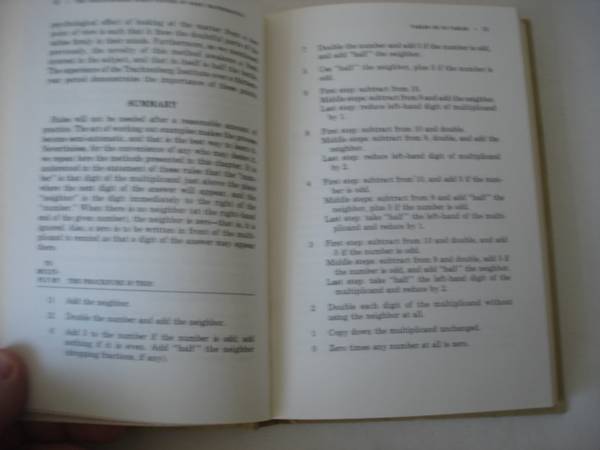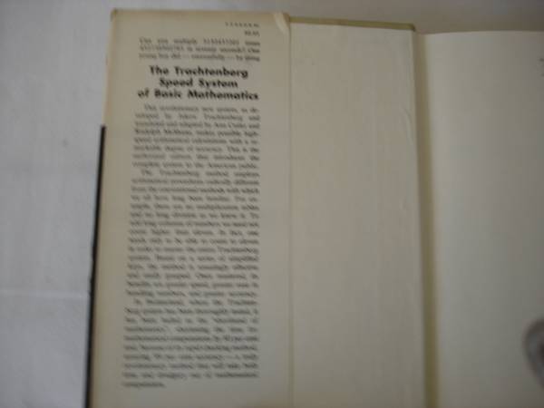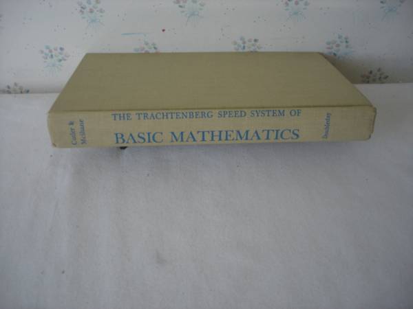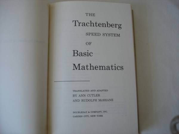 The Trachtenberg Speed System of Basic Mathematics, by Jakow Trachtenberg, Translated and Adapted by Ann Cutler and Rudolph McShane. Hard-Cover (light tan with blue lettering) – First Edition – Published by Doubleday & Company – 1960. No ISBN. Library of Congress Catalog Card Number: 60-13513. 270 Pages.