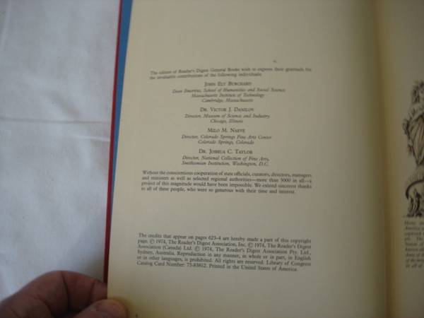 Treasures of America and Where to Find Them, by Joshua C. Taylor, Director and John Ely Burchard. Hard-Cover (red and blue with gold lettering) – First Edition – Published by Reader’s Digest Association – 1974. No ISBN. Library of Congress Catalog Card Number: 73-83812. 624 Pages which includes Picture Credits.