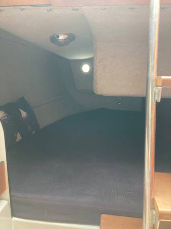 Boat has double quarter berth and large wrap around dinette with lowering table for a converting v berth.
