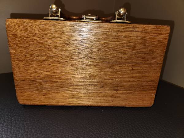 Vintage MidCentury Modern Wooden purse, carved geometric pattern, suede interior, leather hinges. In very good condition. 10"x 6"x 3"