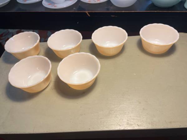 6 Fire-King Peach Lustre 6 oz custard cup with a scalloped rim