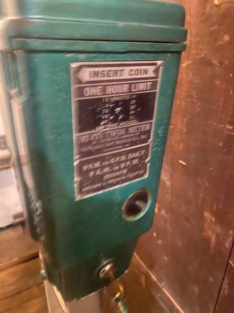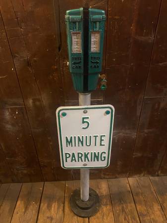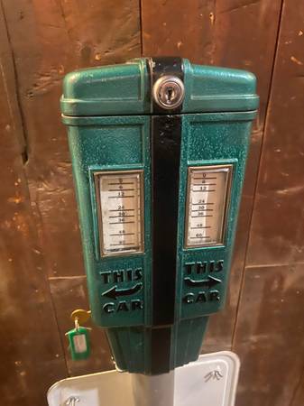 1940’s parking meter with keys to both locks comes with stand and metal parking sign all guts inside ( not working) 250.00 no shipping pick up only no trades