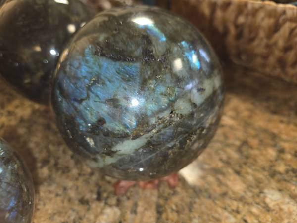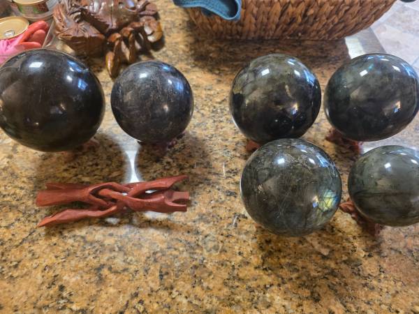2 solid Fireworks Stone healing spheres , 6" & 4 1/2" . 4 solid Labradorite carved solid stone healing spheres .2 - 5" . 1 - 4.5" . 1- 4" . Variety of stands . Selling as a unit . Reasonable...