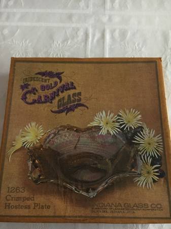 Indiana Glass Co. #1263 Crimped Hostess Plate Iridescent Gold Carnival Glass In Original Box, perfect condition Listed on eBay for $62.93 Local Pick Up and Cash Only