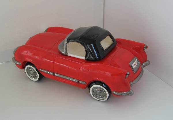 Chevrolet Corvette C1 (the glaze color choice suggests it may be a 1954 or 1955 model) was made as a ceramic cookie jar by Expressive Designs in the 1980s. It's in its original box. I don't recommend shipping, but if you wish, that would be possible at your expense. If you collect Chevrolet or Corvette memorabilia, this rare item might be a delightful addition to your own display shelf --or -- as a gift to a friend who is a Corvette enthusiast.