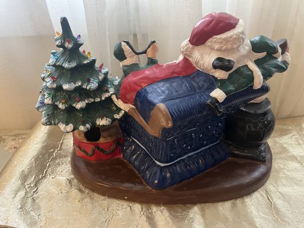Large approx 16/17 inches wide x 1 foot tall. Santa warms by a pot belly stove enjoying joy chocolate with 2 elves. A festive Christmas tree lights the scene, add your own corded or battery pack of lights in the back holes or underneath. A rare Black Bird Mood, similar over $375 plus