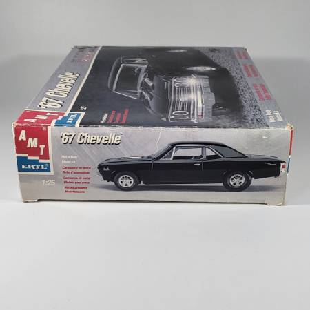 Vintage AMT/ERTL 1967 Chevrolet Chevelle metal body model kit #30008, 1/25 scale. The box is opened but the parts are still sealed in plastic bags. The box has some shelf wear and a few torn spots from opening the box.