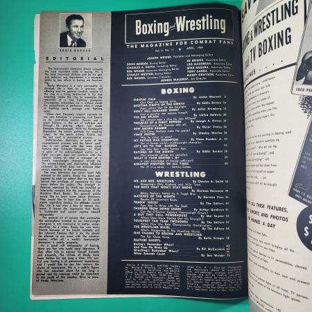 Boxing and Wrestling magazine, dated April 1954. Articles on or pictures of, Ezzard Charles, Danny Nardico, Rex Layne, Harold Johnson, Wes Echols, Bobo Olson, Yolande Pompey, Al Andrews, Ernie Durando, Jack Johnson, Louis Kid Kaplan, Coley Wallace, Aaron Wilson, Vince Foster, Rudy Goldstein, Joe Dundee, Max Baer, Tommy Farr, Sammy Cohen, Al and Ada Szasz, Bobby Nelson, Jack O'Reilly, Ella Waldek, Mildred Burke, John Henning, Roland Meeker, Wladek Kowalski, Pat O'Bill Melby, Billy Darnell, Lord Blears, Lord Layton, Pat Flanagan, Whipper Watson, Ray Eckert, Fred Atkins, Steve Stanlee, Robert Duranton, Tiny and Al Mills, Mike and Ben Sharpe, ads, and more. Great condition for its age.