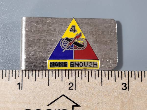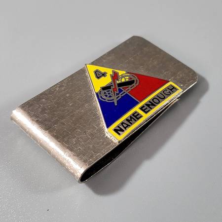 Vintage metal US Army 4th Armored Division, Name Enough money clip. Measures 1.75” x 1”. It is in perfect condition, probably never been used.