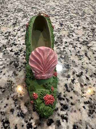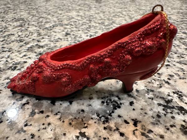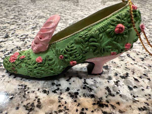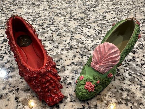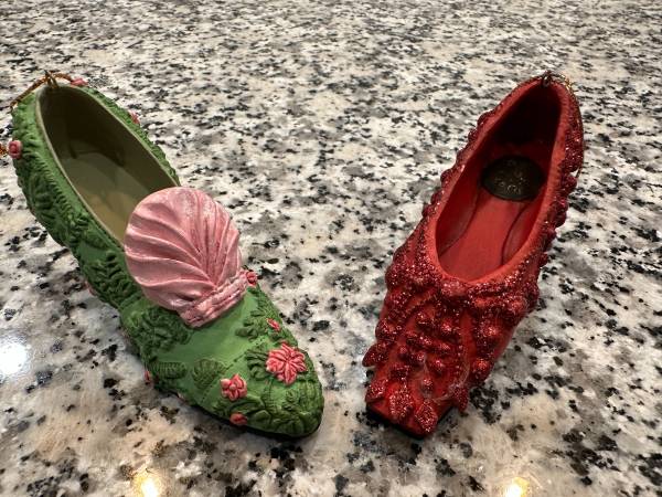 Shoe Christmas Ornaments By: Metropolitan Museum of Art Set of 2: - Christian Dior Red Shoe - Ladies Green/Pink Victorian Shoe In Good Condition In Person, Cash Sale Only Must Pick-Up, No Shipping...