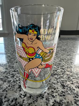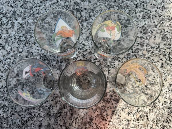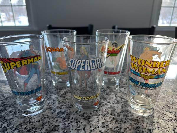 DC Comics 'Toon Tumblers Clear Glass, Set of 5 By: 'Toon Tumblers/DC Comics Set Includes: - Superman - Supergirl - Wonder Woman - Aquaman - Robin the Boy Wonder Excellent Condition Priced and Sold...