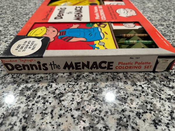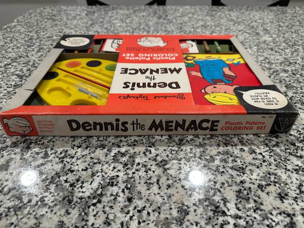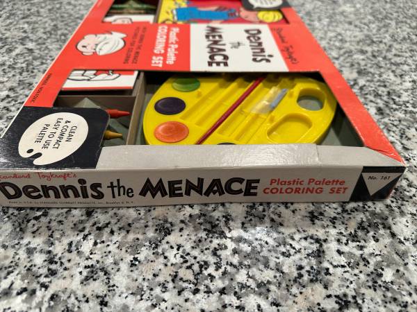 Dennis the Menace Plastic Palette Coloring Set With Dennis the Menace Pictures for Coloring By: Standard Toy Kraft In Good Condition Original Box (Cellophane missing from box top) 1 crayon missing,...
