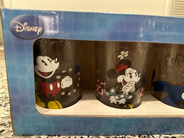 Disney Juice Glasses Set of 4, 8 oz. Glasses * Mickey Mouse * Minnie Mouse * Goofy * Donald Duck New in Box In Person, Cash Sale Only Must Pick-Up, No Shipping or Delivery