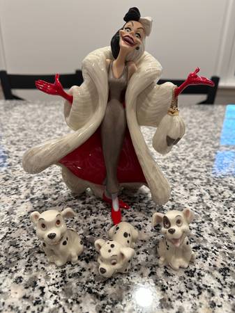 Cruella de Vil and 3 Dalmatians (4 Piece Set) By: Lenox/Walt Disney Showcase Collection Porcelain Figurines Original Box In Excellent Condition Cruella Approx. 8" L x 4" W x 9" H Dalmatians Approx....