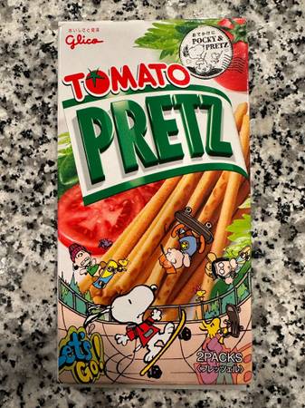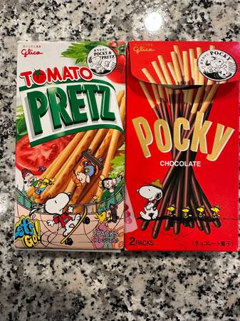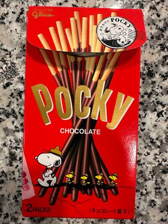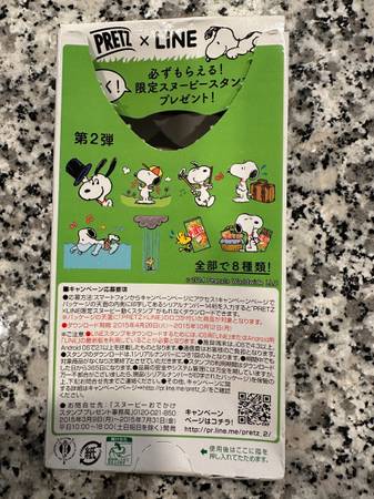 Japanese Snack Boxes with Peanuts Characters, Circa. 2014 By: Glico, A Japanese Snack Company Set of 2 (Sold Only as a Set): 1. Pocky Chocolate Box Snoopy & Woodstock on Front Charlie Brown on...
