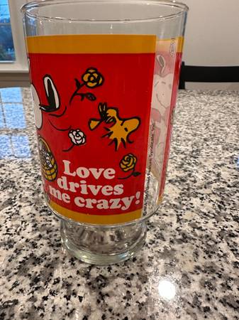 Peanuts - Snoopy 30 oz. Glass/Tumbler "Love drives me crazy!" By: United Feature Syndicate, Inc./Peanuts In Excellent Condition Approx. 3.75" Diameter, 7" Tall In Person, Cash Sale Only Must...