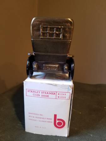 Vintage 1910 Stanley Steamer Coin Bank, Banthrico. 5 1/2 " long, 3 1/2" high, 3" wide. 1974 promotional coin bank in original box with key.