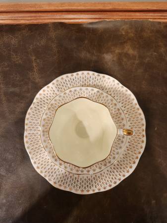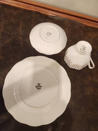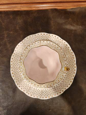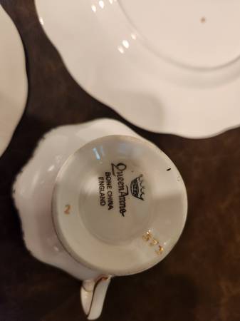 Tea for 2, Queen Anne tea settings, 1, rose color tea cup, dessert plate and saucer, 1 lemon color tea cup, dessert plate and saucer. Each dessert plate and cup have matching color. All are gold leaf rimmed, with gold leaf decorations. Bone china. Dessert plat 8.5", saucer, 5.75", tea cup, 3.5" diameters. In excellent condition, appear to have never been used.