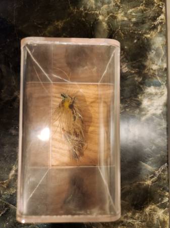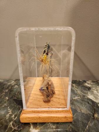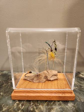 2 vintage Salmon Flies, handmade by Paul Rossman. In display case, red oak with plexiglass, 5 1/2" high, 4 1/2"wide, 2 1/2" deep. In original excellent condition, unused.