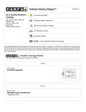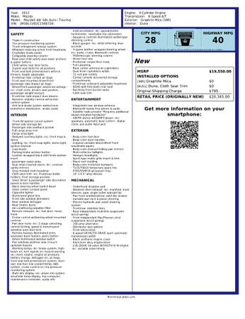 For sale is 2012 Mazda 3i Touring Sedan excellent condition. This car has a 2.0L four-cylinder engine, automatic transmission, and is front wheel drive. It runs, drives, and shifts great! Features include AM/FM/CD/Aux Stereo System, Bluetooth connection w/steering-wheel audio controls, clean cloth interior, 16" alloy wheels, cruise control, power accessories and more.