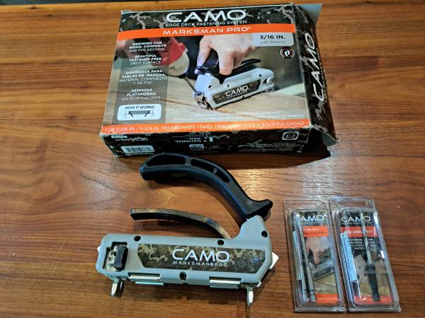 This tool was carefully used to install a smaller deck. It is in excellent condition. Included with the tool are are 4 new, unused CAMO T15 driver bits and a new, unused CAMO 3/16 drill for pre-drilling hardwood.